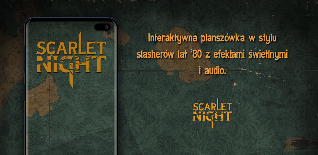 Witaj w Scarlet Night. Interaktywnej planszówce w stylu slasherów lat '80 z efektami świetlnymi i dźwiękowymi.